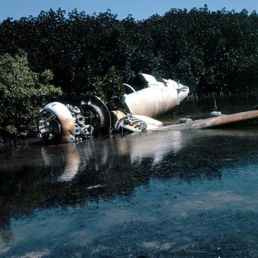 Virtually-intact Vought F4U Corsair in mudflats opposite Quoin Hill airstrip, Efate, New Hebrides (Vanuatu), July 1975